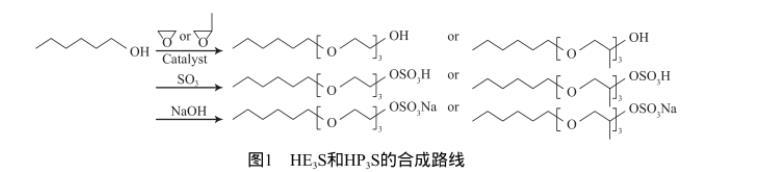 根據(jù)文獻(xiàn)[11]報(bào)道的方法,在高壓反應(yīng)釜中加入正己醇和烷氧基化催化劑,升溫后通入環(huán)氧乙烷或環(huán)氧丙烷,分別合成正己醇聚氧乙烯醚(HE3)與正己醇聚氧丙烯醚(HP3)。隨后用經(jīng)發(fā)煙硫酸制備的三氧化硫,與HE3或HP3進(jìn)行硫酸化反應(yīng)后再用氫氧化鈉中和,最后經(jīng)除鹽和萃取提純得到淺黃色膏狀HE3S和HP3S,合成路線如圖1所示。