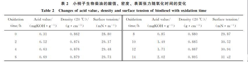 不同氧化時間小桐子油生物柴油的酸值、表面張力與密度的測定結(jié)果如表2所示。從表2可得,氧化14h的小桐子生物柴油的酸值由未被氧化時的0.31 mgKOH/g增加到2.02 mgKOH/g,增加了551%,超過ASTM D6751(2001)中規(guī)定生物柴油酸值的最大值(0.5 mgKOH/g)。這是由于小桐子生物柴油在氧化后期形成了一些醛類,如己醛和壬醛(見表1),這些醛類經(jīng)過復雜的二次氧化反應轉(zhuǎn)化為酸類物質(zhì),從而導致酸值增加;同時,生物柴油會吸收水分,導致酯的水解,也可使酸值增加。