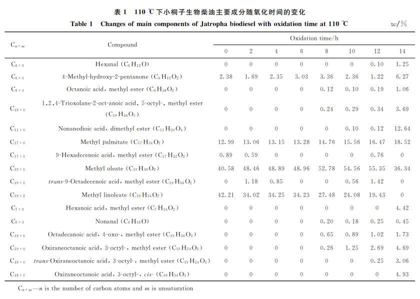 小桐子生物柴油氧化期間GC-MS組成分析結(jié)果見表1。由表1可知,小桐子生物柴油的主要成分是棕櫚酸甲酯、油酸甲酯、亞油酸甲酯,歸一化后的質(zhì)量分數(shù)為95.78%。在氧化過程中,含有2個碳碳雙鍵的亞油酸甲酯的含量降低,氧化0h的小桐子生物柴油亞油酸甲酯(C19:2)質(zhì)量分數(shù)為42.21%,加速氧化14h,質(zhì)量分數(shù)為0,說明亞油酸甲酯幾乎完全氧化,這是因為多不飽和脂肪酸甲酯比單不飽和脂肪酸甲酯更容易氧化。與單不飽和脂肪酸相比,亞油酸甲酯的碳鏈含有更多的雙烯丙基位點,雙烯丙基質(zhì)子對氧自由基的攻擊敏感,導致分子發(fā)生氧化,從而形成過氧化合物,過氧化合物進一步氧化轉(zhuǎn)化成醛、酮等化合物。