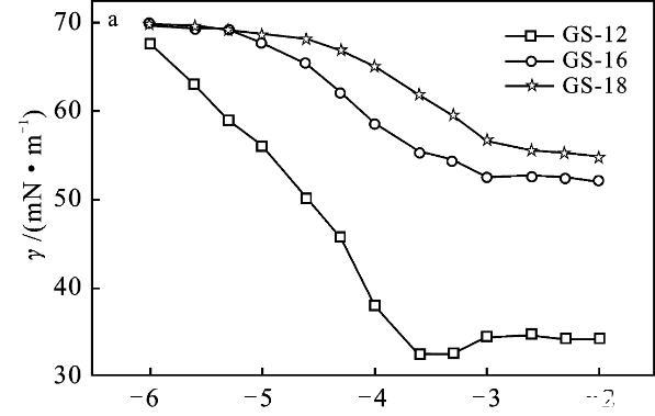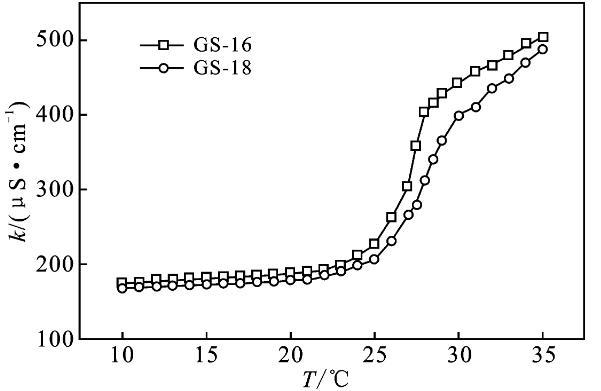 2.2.1 Krafft溫度Krafft溫度影響表面活性劑溶解度,表面活性劑在此溫度以上可以形成膠束。在Krafft溫度以下,以單分散的表面活性劑與水化固體表面活性劑的狀態(tài)存在,而在Krafft溫度以上,水化固體表面活性劑的溶解和膠束形成也參與了平衡[9-10]。質(zhì)量分?jǐn)?shù)1%表面活性劑GS-12,在室溫可以完全溶解,將其溶液置于冰水混合物中1周,溶液仍然澄清透明,沒有渾濁的跡象。表明GS-12的Krafft溫度低于0℃。通過測量電導(dǎo)率可以得到Krafft溫度的近似值,由圖3可知,GS-16,GS-18的Krafft溫度分別為27,27.5℃。k值在較低溫度下緩慢增加,這是由于離子表面活性劑的溶解度有限。隨著溫度的進(jìn)一步升高,Krafft溫度處的k值急劇增加。k值的增加是由于膠束的形成,水合表面活性劑的溶解度突然增加,直至達(dá)到克拉夫特溫度。此外,離子遷移率增加隨著溫度增加、k逐漸增加[3,10]。結(jié)果表明,Gemini表面活性劑的Krafft溫度隨表面活性劑的疏水鏈長的增加而升高。