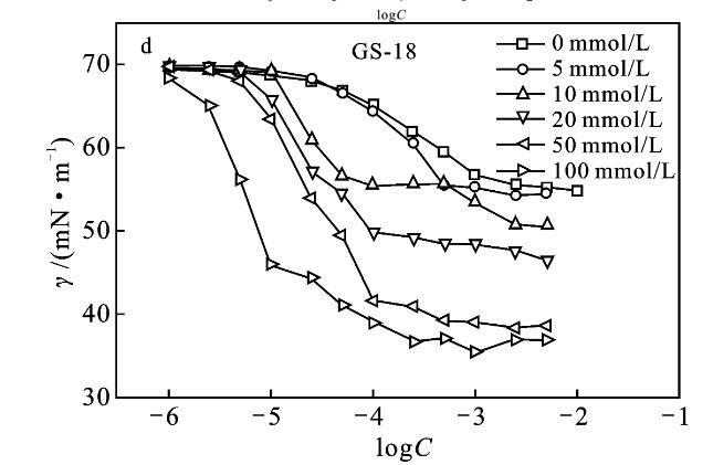 圖5表面活性劑GS-12,GS-16,GS-18溶液的表面張力隨濃度變化曲線(a)和Gemini表面活性劑的表面張力隨KBr鹽濃度的變化曲線(b~d)
