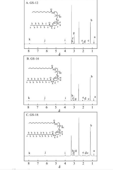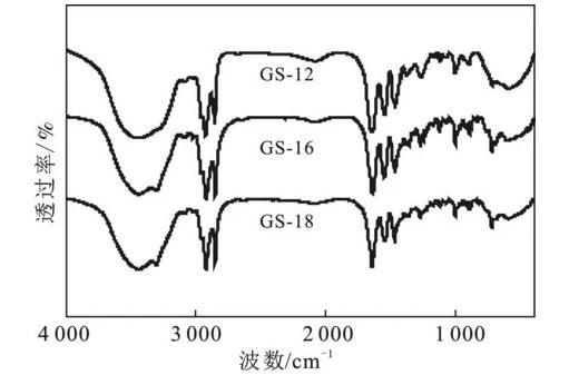 根據(jù)方案1的合成路線,成功制備了3種以1,4-二溴-2-丁烯為連接基團(tuán)的酰胺基Gemini表面活性劑。利用紅外和核磁對酰胺基Gemini表面活性劑GS-12,GS-16,GS-18進(jìn)行結(jié)構(gòu)表征,結(jié)果見圖1和圖2。
