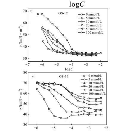 表面張力測量是研究表面活性劑CMC值的一種有效方法。濃度的增加降低了溶液的表面張力,然后達(dá)到一個恒定值,則會產(chǎn)生一個明確的轉(zhuǎn)折點(diǎn),表明膠束化的開始。在CMC之下,表面活性劑分子排布于空氣/水界面上來降低表面張力。在CMC以上,外加表面活性劑單體,當(dāng)表面活性劑單體充分填充表面時,更傾向于與膠束結(jié)合而不是進(jìn)入界面膜[3,7]。因此,γ與lgC的關(guān)系圖陡然減小,直至達(dá)到CMC,并在CMC以上變得相對恒定。圖5為不同的KBr鹽濃度下,陽離子Gemini表面活性劑混合溶液的表面張力圖。