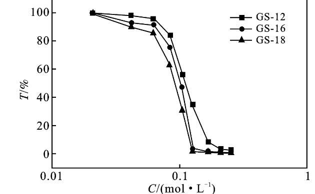 2.2.2耐鹽性能隨著鹽濃度的增加,濁度的突然增加是表面活性劑溶液中宏觀相分離的標(biāo)志,這就是鹽析現(xiàn)象[7,11]。圖4為KBr/GS表面活性劑溶液,隨著KBr含量的增加,在波長為500 nm的吸光度變化曲線。以GS-12為例,當(dāng)KBr濃度為0~60 mmol/L時,1 mmol/L的Gemini表面活性劑水溶液為無色透明,濁度同時略有下降,說明有混合膠束形成。當(dāng)KBr的濃度從60 mmol/L增加到120 mmol/L時,溶液呈現(xiàn)微渾濁,說明體系中有少量的表面活性劑顆粒析出。而GS-16,GS-18在更低的濃度下就發(fā)生了鹽析現(xiàn)象。也就是說,鹽的析出現(xiàn)象是非常復(fù)雜的,這不僅取決于鹽的性質(zhì),而且取決于雙子表面活性劑的結(jié)構(gòu)[12-13]。此外,由圖4透過率的變化可知,隨著疏水鏈的增長,表面活性劑的耐鹽性能減弱,更容易受鹽濃度的影響。因?yàn)闊o機(jī)鹽消除離子頭基團(tuán)的電荷,減少吸附膜內(nèi)頭基基團(tuán)與膠束之間的靜電排斥。它們通過減少頭基之間的靜電相互作用和最小化有效截面積來促進(jìn)膠束的產(chǎn)生和聚集,導(dǎo)致表面活性劑從溶液中聚沉而析出[13]。