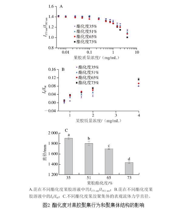 如圖2B所示,芘在高酯化度果膠溶液中表現(xiàn)出更高的IE/IM。這可能是因為高酯化度果膠形成的聚集體內(nèi)部具有更多且極性更低的疏水微區(qū),促進了芘分子在疏水微區(qū)中的溶解和分布,進而增加了芘二聚體的形成,最終導致IE/IM升高。這一結(jié)果進一步驗證了高酯化度果膠形成的聚集體更疏水的結(jié)論。