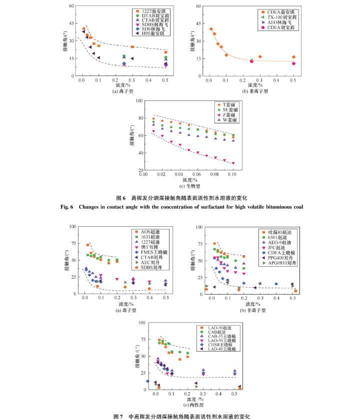 固體表面的潤(rùn)濕性可用接觸角表征,反映了液體與固體表面相互作用的程度,接觸角隨液體表面張力的降低而不斷減小。由圖5至圖10可知,對(duì)于不同變質(zhì)程度煤,離子、非離子和兩性型表面活性劑水溶液濃度小于0.1%時(shí),接觸角隨濃度的增加而迅速降低。例如,圖7(b)所示的CDEA與中高揮發(fā)分煙煤間的接觸角從38.8°降低至21.2°。當(dāng)表面活性劑水溶液濃度在0.1%~0.2%之間,接觸角的下降幅度明顯減緩;當(dāng)濃度大于0.2%時(shí),接觸角逐漸趨于穩(wěn)定。整體而言,離子、非離子和兩性型表面活性劑水溶液在煤表面的接觸角隨溶液濃度的升高表現(xiàn)出降低趨勢(shì),在濃度0.1%會(huì)出現(xiàn)明顯的拐點(diǎn)。而生物型表面活性劑水溶液與高揮發(fā)分煙煤間的接觸角隨濃度增大呈降低趨勢(shì),且在試驗(yàn)濃度0~0.1%范圍內(nèi)的接觸角均大于25°。