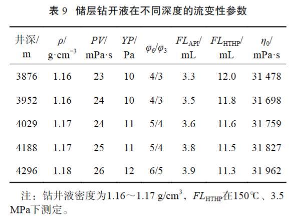 由表9可以看出,鉆開液的流變性在不同深度下變化不大,密度為1.16~1.18 g/cm3,動切力維持在10~13 Pa。鉆進扭矩從前期的平均12.86 kN·m下降到8.76 kN·m,同時沒有明顯的井徑不規則和擴徑現象,沒有出現井下鉆具斷裂等復雜情況,且井眼清潔效果良好;高溫高壓濾失量隨著井深增加逐漸下降,儲層鉆開液的濾餅厚度為0.5 mm,測試期間日產氣量為910 000 m3,表皮系數僅為0.13。