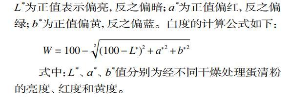 用色差儀直接測定蛋清粉的亮度值(L*)、紅(a*)、黃(b*)。測定5次取平均值。L*為正值表示偏亮,反之偏暗;a*為正值偏紅,反之偏綠;b*為正值偏黃,反之偏藍。白度的計算公式如下: